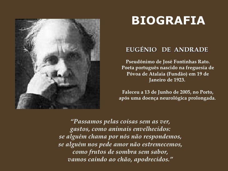 - Por isso, Eugénio de Andrade FICA, hoje com 96 anos se coabitasse no mundo dos vivos. Assim, vive na eterniDADE. .